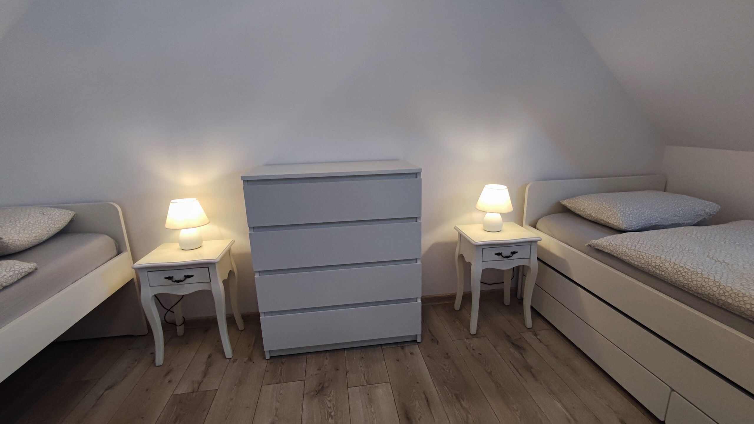 2 sypialnie: 2-osobowa z łóżkiem małżeńskim i 3 lub 4-osobowa z łóżkami pojedynczymi (w domku z 3-osobową sypialnią jest dodatkowo sypialnia 1-osobowa)