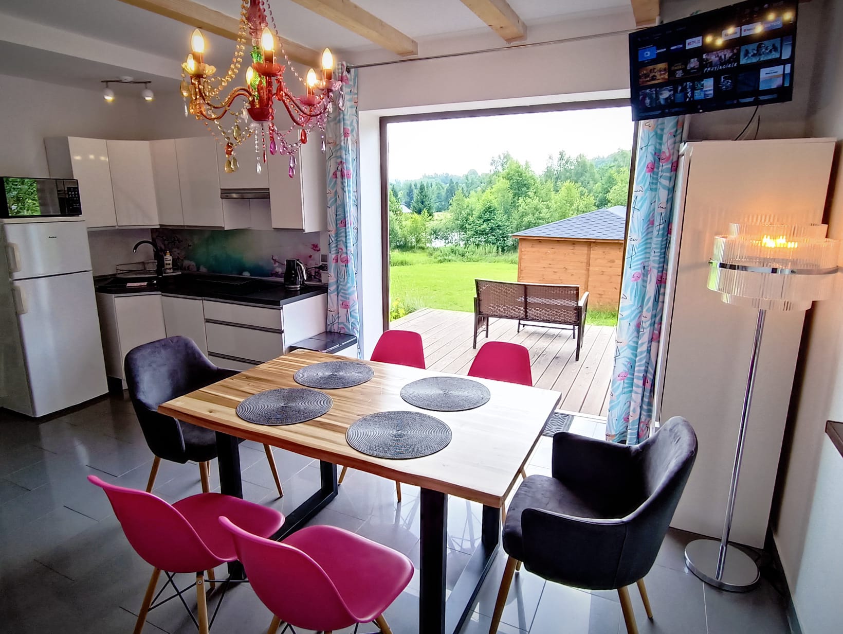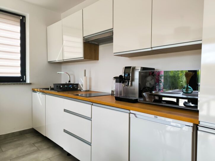 do dyspozycji gości jest salon z nierozkładaną sofą, aneks kuchenny z pełnym wyposażeniem (płyta indukcyjna, lodówka, zmywarka, kuchenka mikrofalowa z piekarnikiem, czajnik, kafeteria, ekspres do kawy na kapsułki „Delta-Q”, komplet naczyń itp.), łazienka z WC i natryskiem, dodatkowe WC